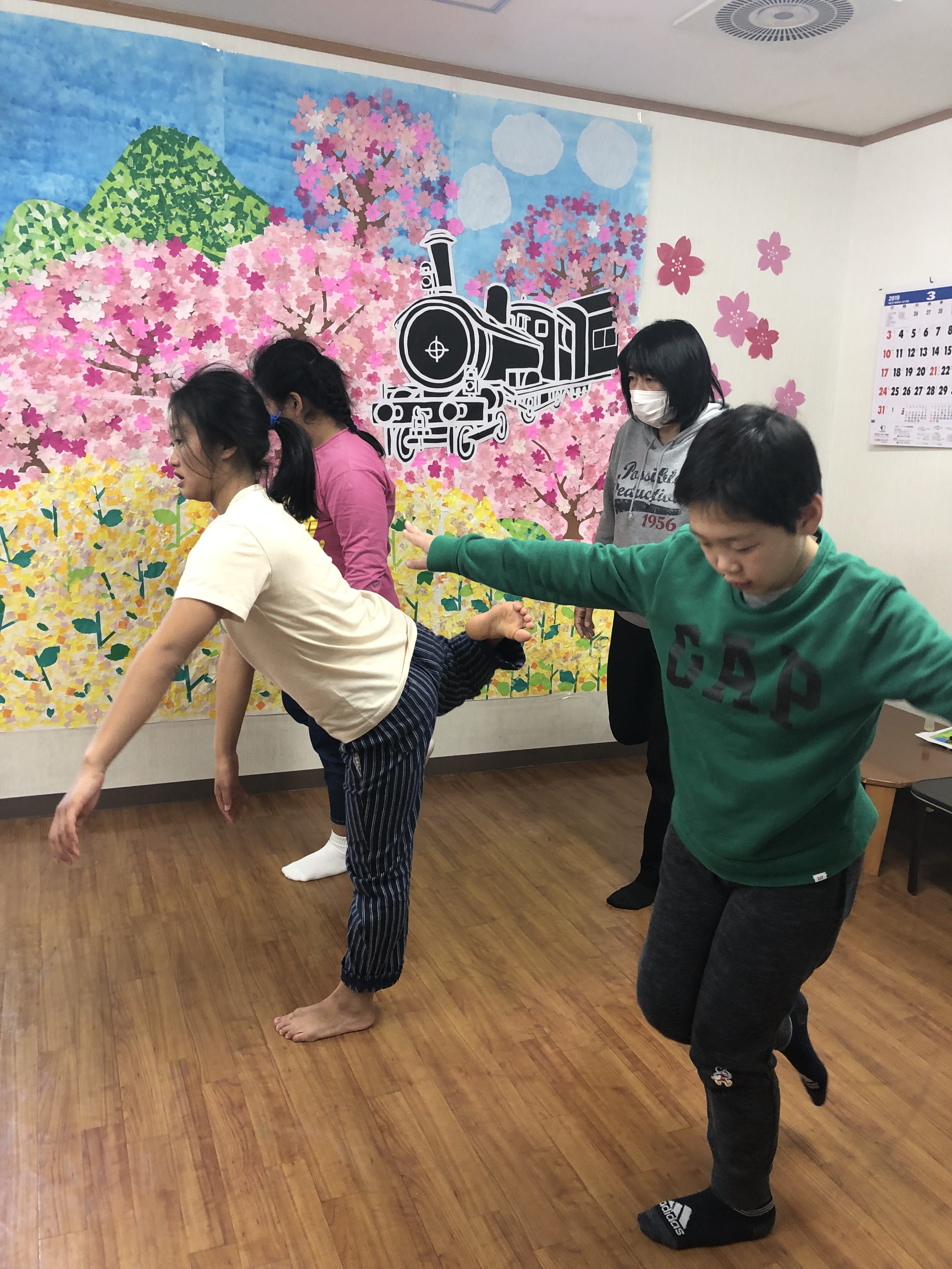 ohana空手教室 2019.03.15 3/14(木)は空手教室でした。 みんなの楽しみな行事の一つです。 下肢のバランスを鍛える体操。いつも様々の 体操を取り入れています。 春の壁画完成🌸 🌼ohana・kiki3人衆🌼